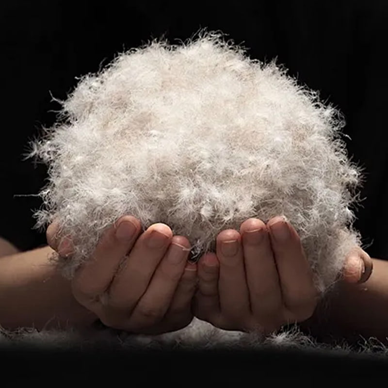 Roghnaítear na croí-réimsí táirgthe síos ar an bolg agus muineál na lachain liath go cúramach, agus úsáidtear próiseas cóimheasa eolaíoch chun lacha liath ard-loft 50% síos agus 50% de shnáithíní cleite ardchaighdeáin a chomhcheangal chun struchtúr ilchodach te nádúrtha a chruthú. Tá an t-síos i gcruth braisle tríthoiseach giolcach, agus tá dromchla gach síos clúdaithe go dlúth le greille pore triantánach beacht chun córas microcirculation rialaithe teochta dinimiciúil a thógáil - nuair a bhíonn sé fuar, cuireann an snáithín curls go nádúrtha chun ciseal inslithe aeir a fhoirmiú, agus nuair a bhíonn sé te, síneann an snáithín chun urscaoileadh taise a chur chun cinn, ag baint amach rialáil dé-chliste teochta agus taise. Is féidir leis an struchtúr snáithín uathúil log an teas a astaíonn an gcorp an duine a ionsú go héifeachtach, agus bacainn inslithe theirmigh nádúrtha a chruthú, go héifeachtach bac a chur ar ionradh na sruthanna fuar seachtracha, agus an t-eispéireas ceart solais agus te a thabhairt.